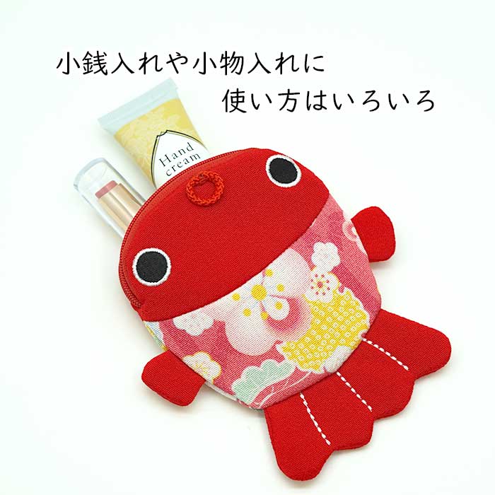 商品名金魚のポーチ 金魚シリーズ商品について金魚のかわいいポーチ。ころんと愛らしい金魚のかたちをした、ちりめん素材のポーチです。まるで水の中を泳いでいるかのような尾びれの揺れが、持っているだけで気分をふわりと涼しくしてくれます。リップやアクセサリー、ちょっとした小物入れにぴったりのサイズ感。バッグの中に入れておくだけで、和の風情と遊び心を添えてくれる、見て楽しい?使って嬉しいアイテムです。お祭り気分のおすそ分けや、和小物好きな方へのギフトにもおすすめ。 6柄よりお選びください。■サイズ縦(全長):約14cm縦(ポーチ部分):約11cm横幅(ポーチ部分):約10cmマチ:約1cm■素材 レーヨンちりめん 綿(裏地)ご注意※商品によって柄の出方や表情等が異なる場合がございます。※レーヨンちりめんは濡れると縮みます。水気にご注意ください。※お客様のモニター環境によっては実物と異なって見える場合もございます。あらかじめご了承下さい。キーワードポーチ 小物入れ 可愛い [金魚のポーチ 金魚シリーズ] 夏 ファスナー 小物入れ 整理 収納 可愛い 贈り物 キャラクター 手作り ハンドメイド 縁起物 金運 マチ付き 季節 四季 ちりめん細工 手作り ハンドメイド 和雑貨 小学生 幼稚園児 保育園児 プレゼント プチギフト